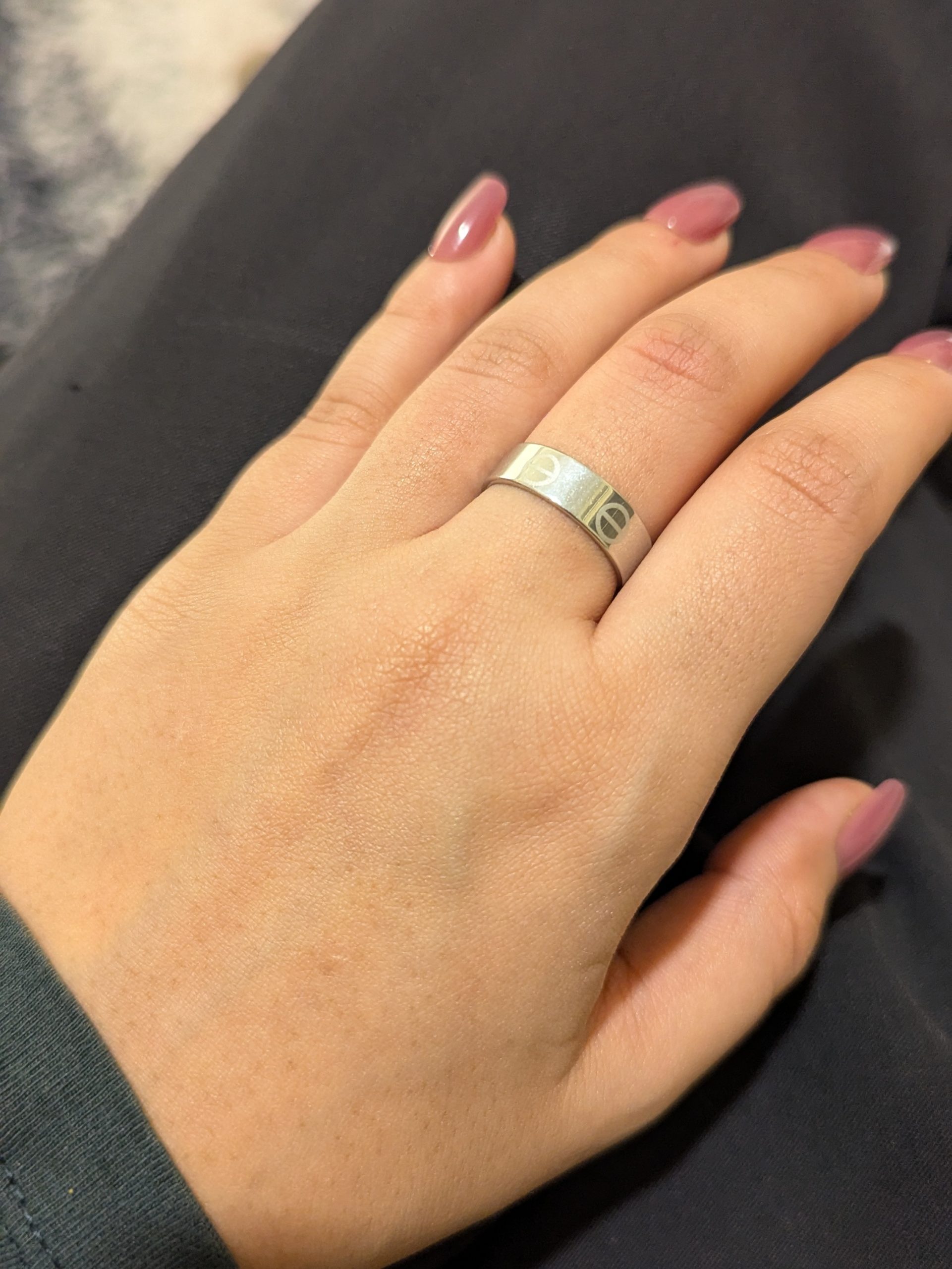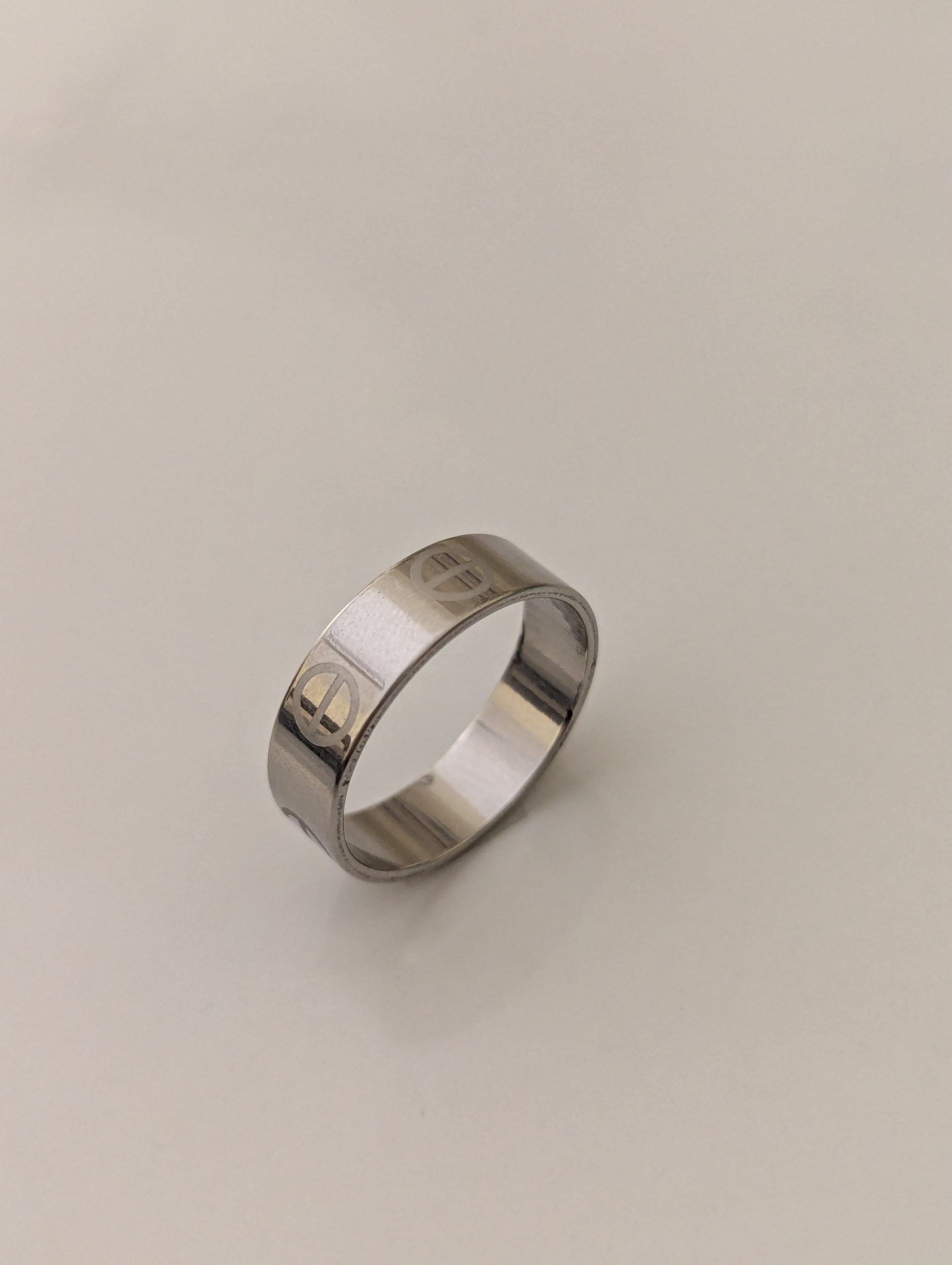 Skip to contentA flat silver band featuring engraved circular motifs for a modern, hardware-inspired look.