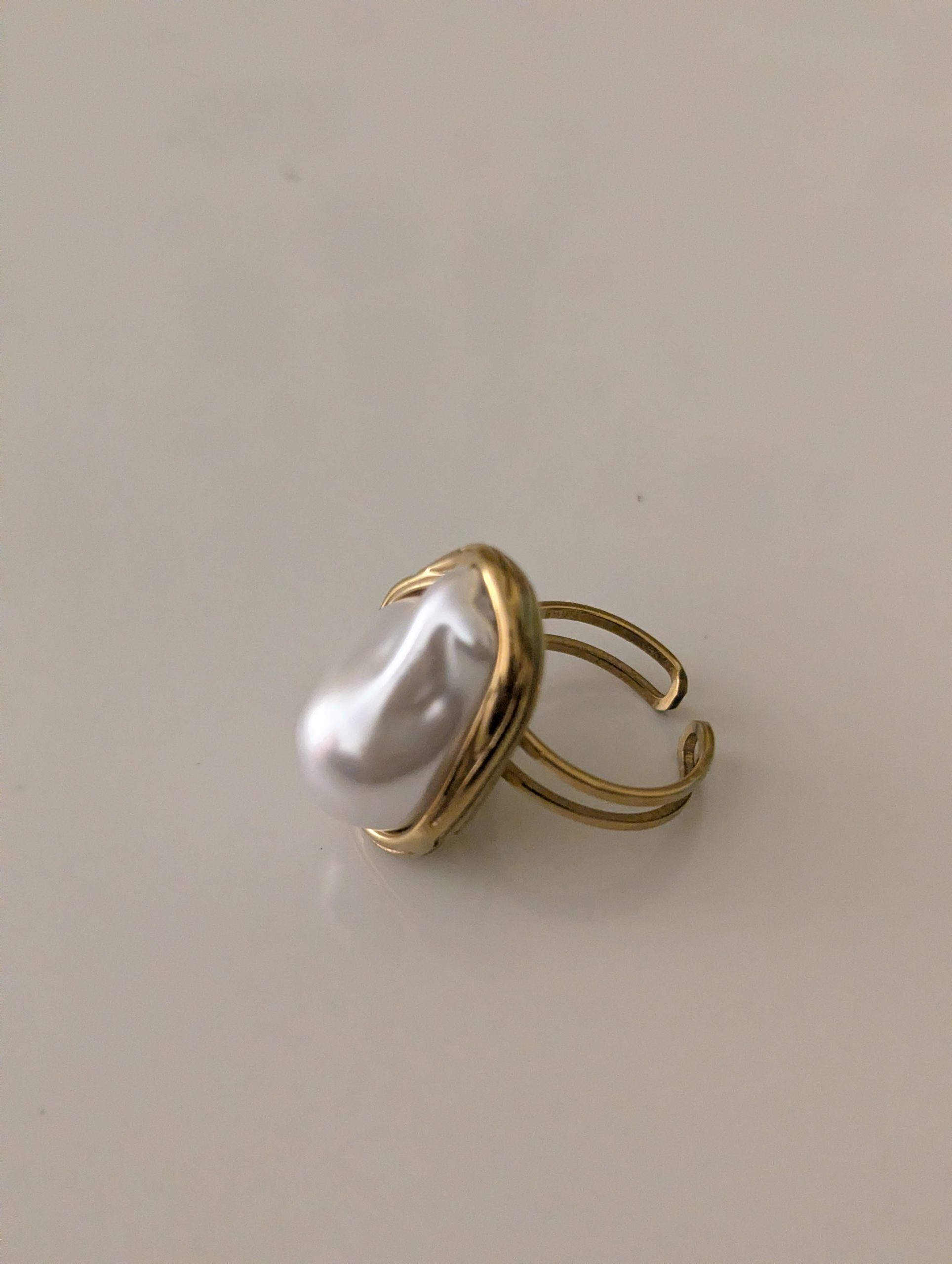 A three-piece jewelry set featuring a pendant on a twisted rope chain, an adjustable ring, and stud earrings. Each piece highlights a large, irregularly shaped baroque-style pearl encased in a thick, organic gold-tone bezel.