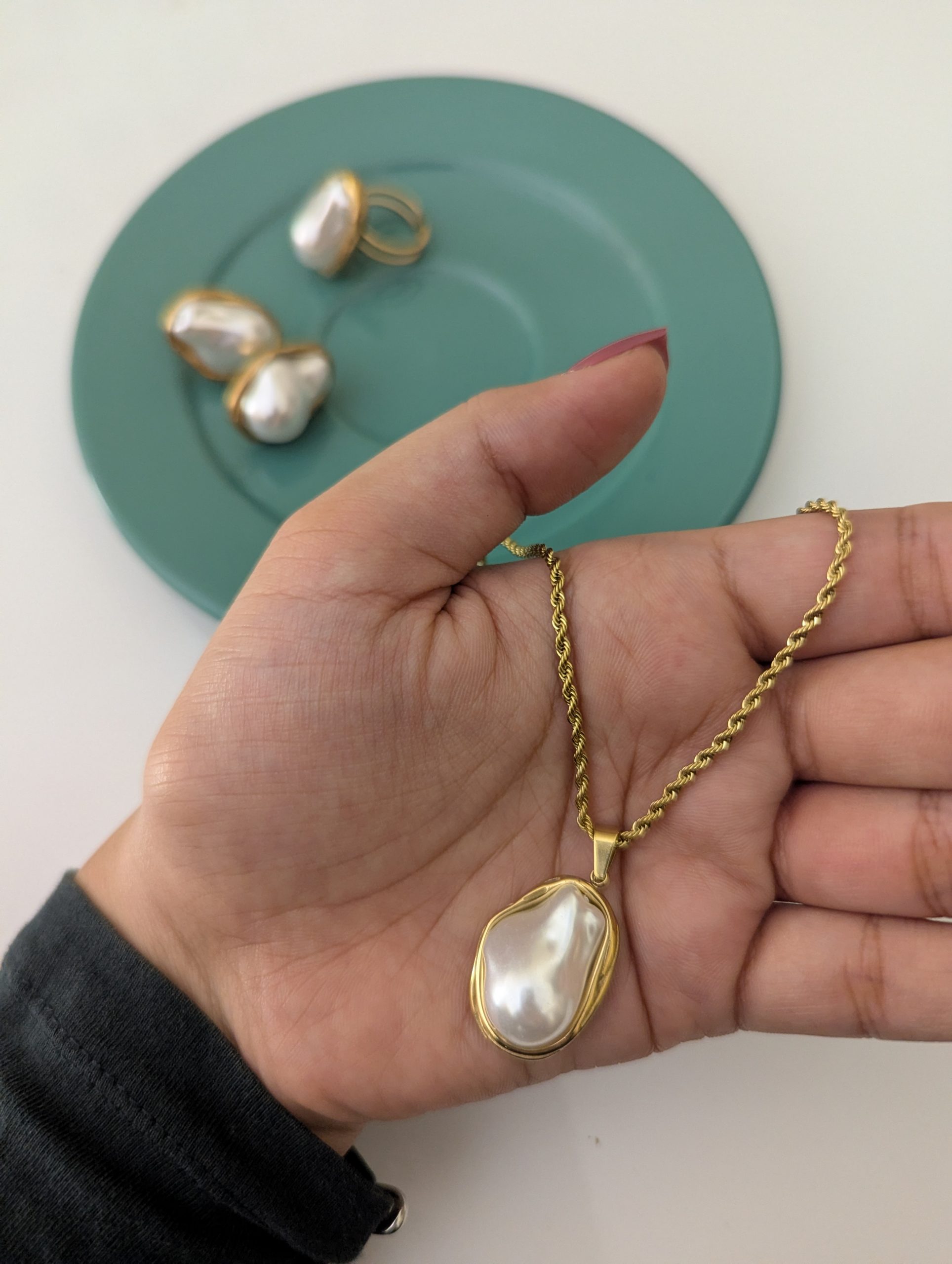 An organic-shaped baroque pearl is cradled in a textured gold-tone frame, suspended from a classic rope chain. This piece blends vintage-inspired charm with modern sophistication for a truly unique statement.