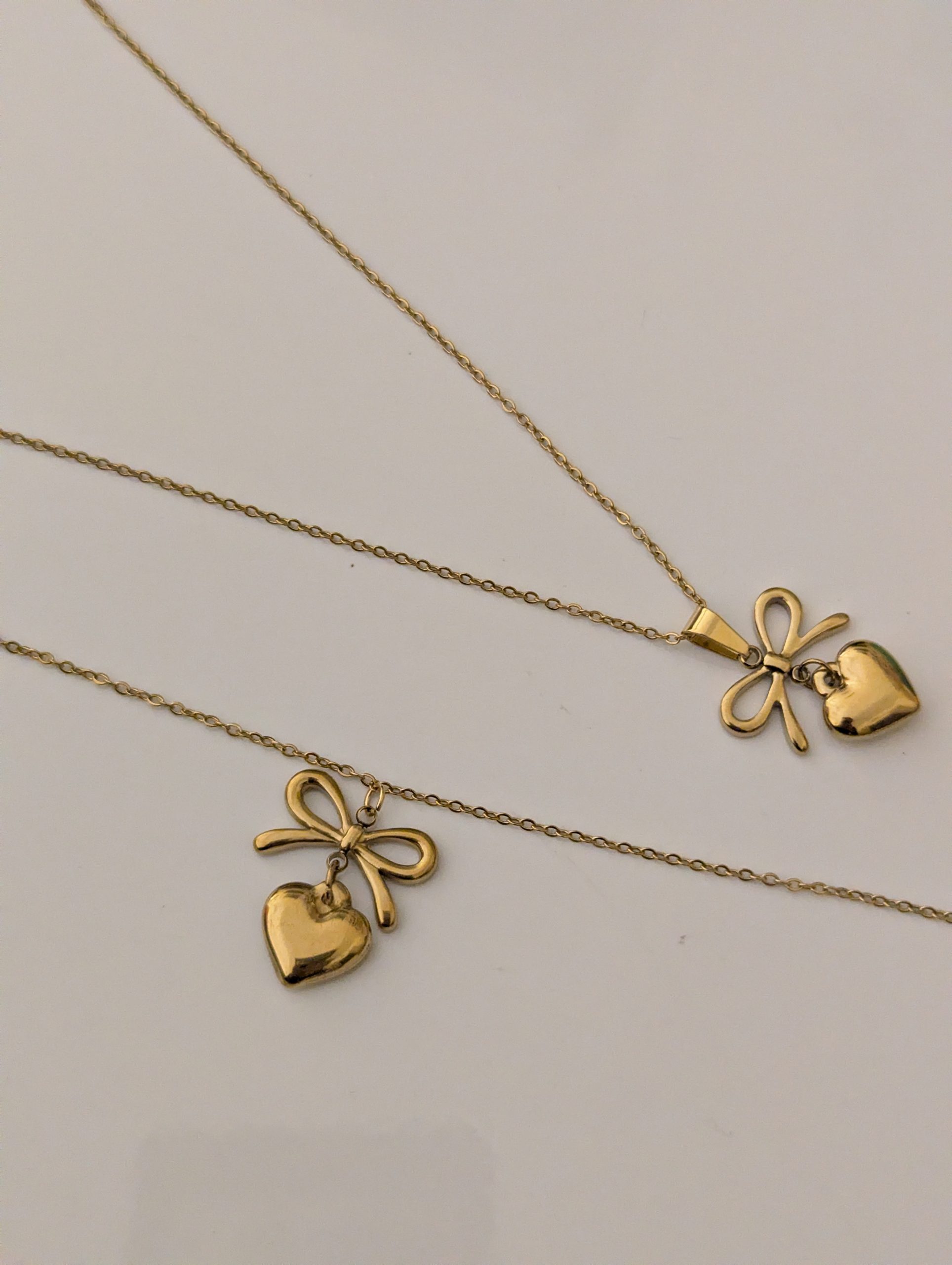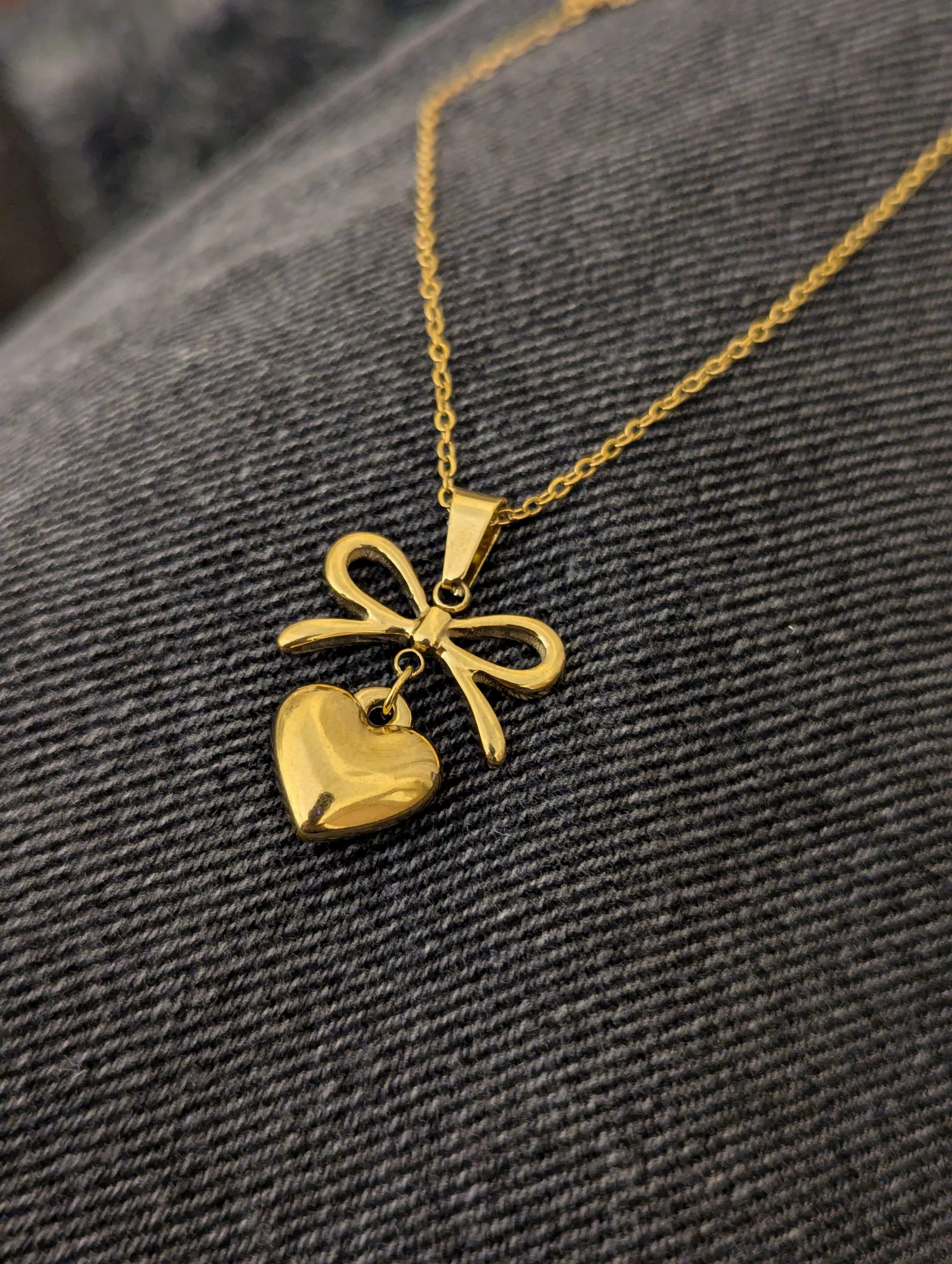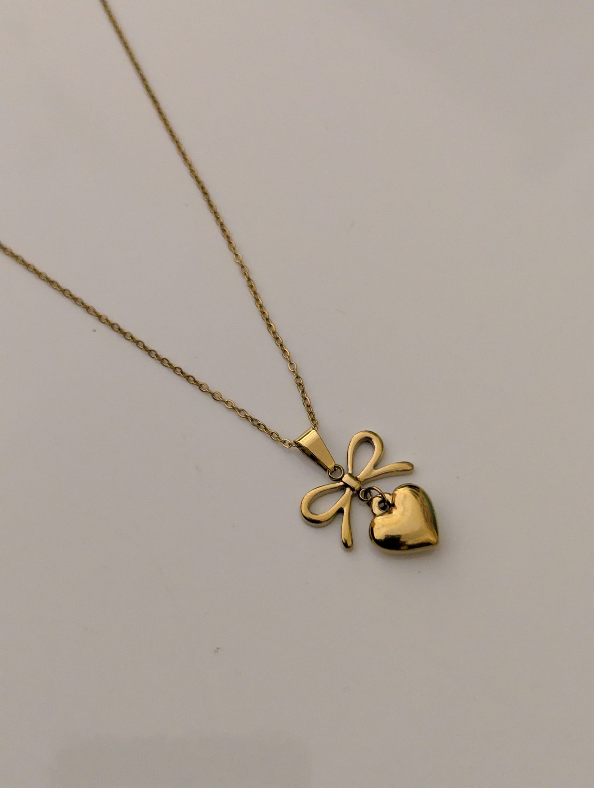 A charming gold necklace featuring a polished bow motif paired with a classic dangling heart charm.