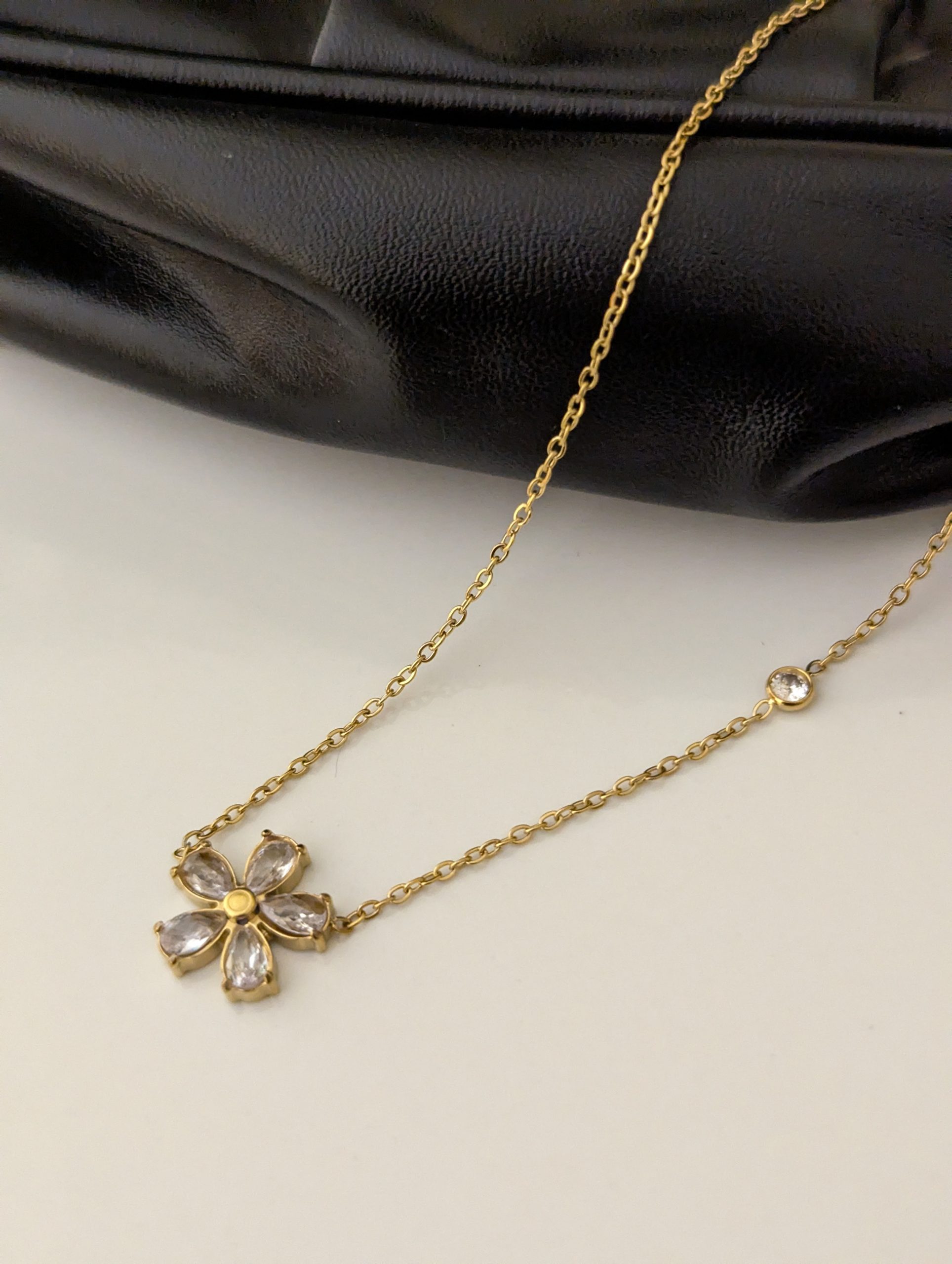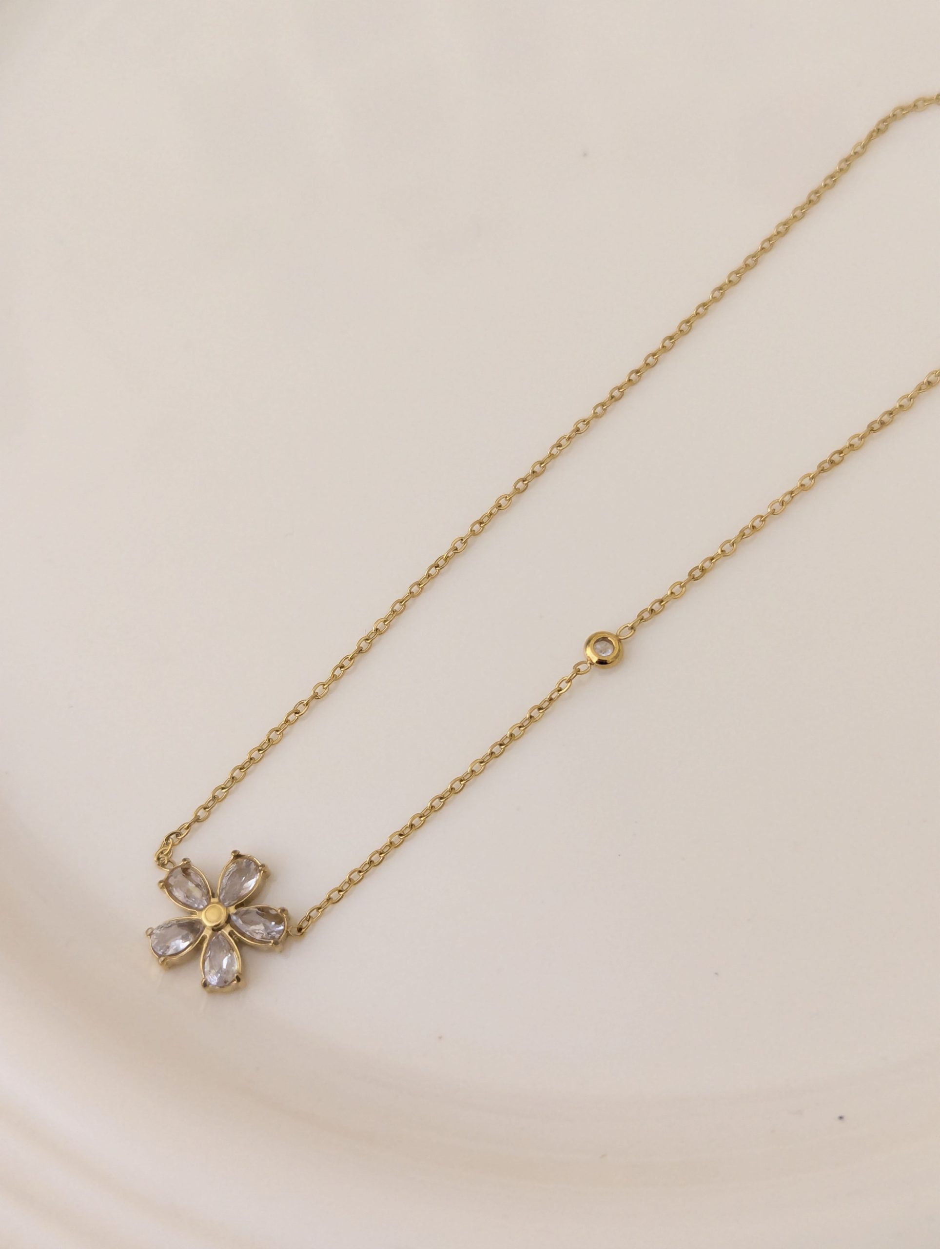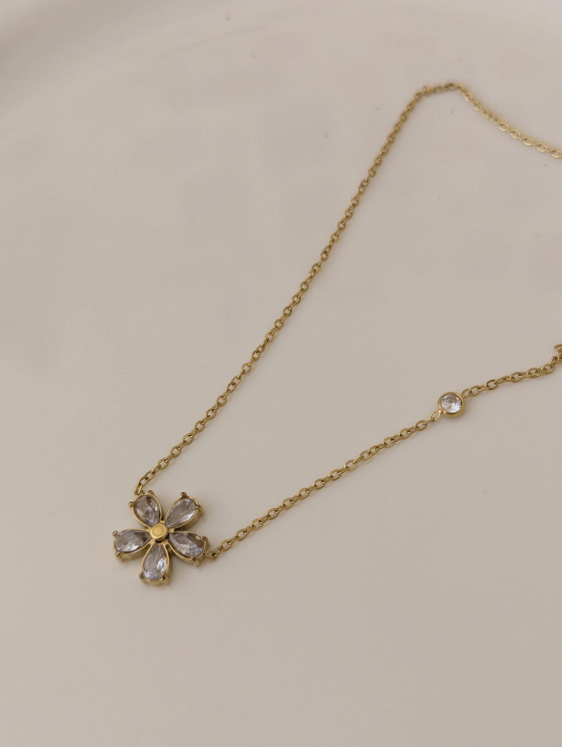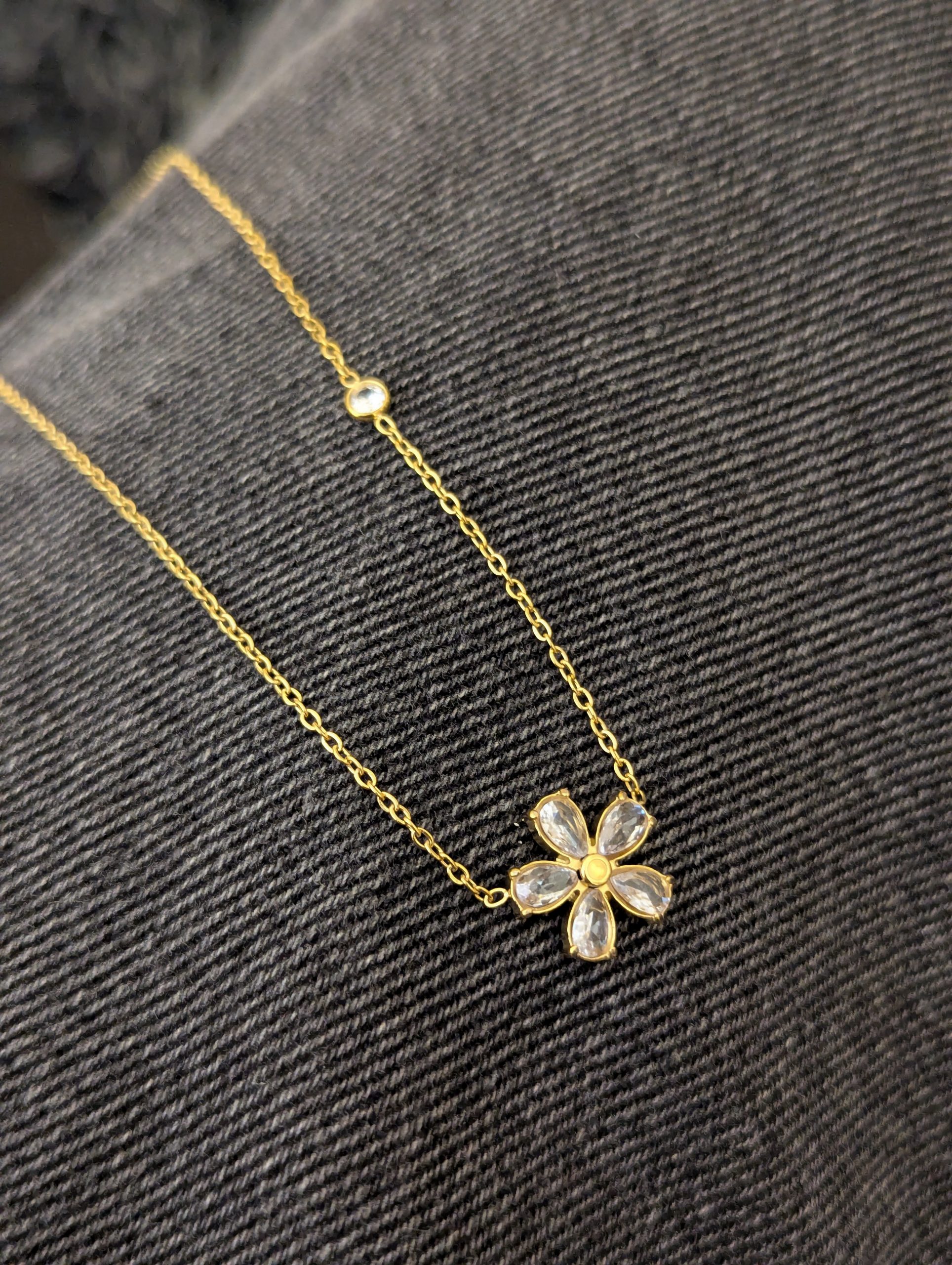 A delicate gold link chain featuring a sparkling five-petal crystal flower and a singular bezel-set accent.