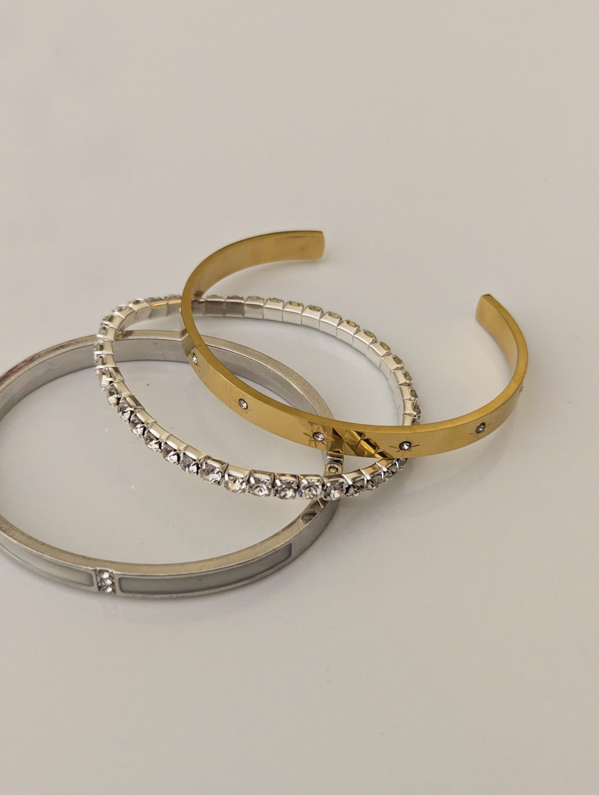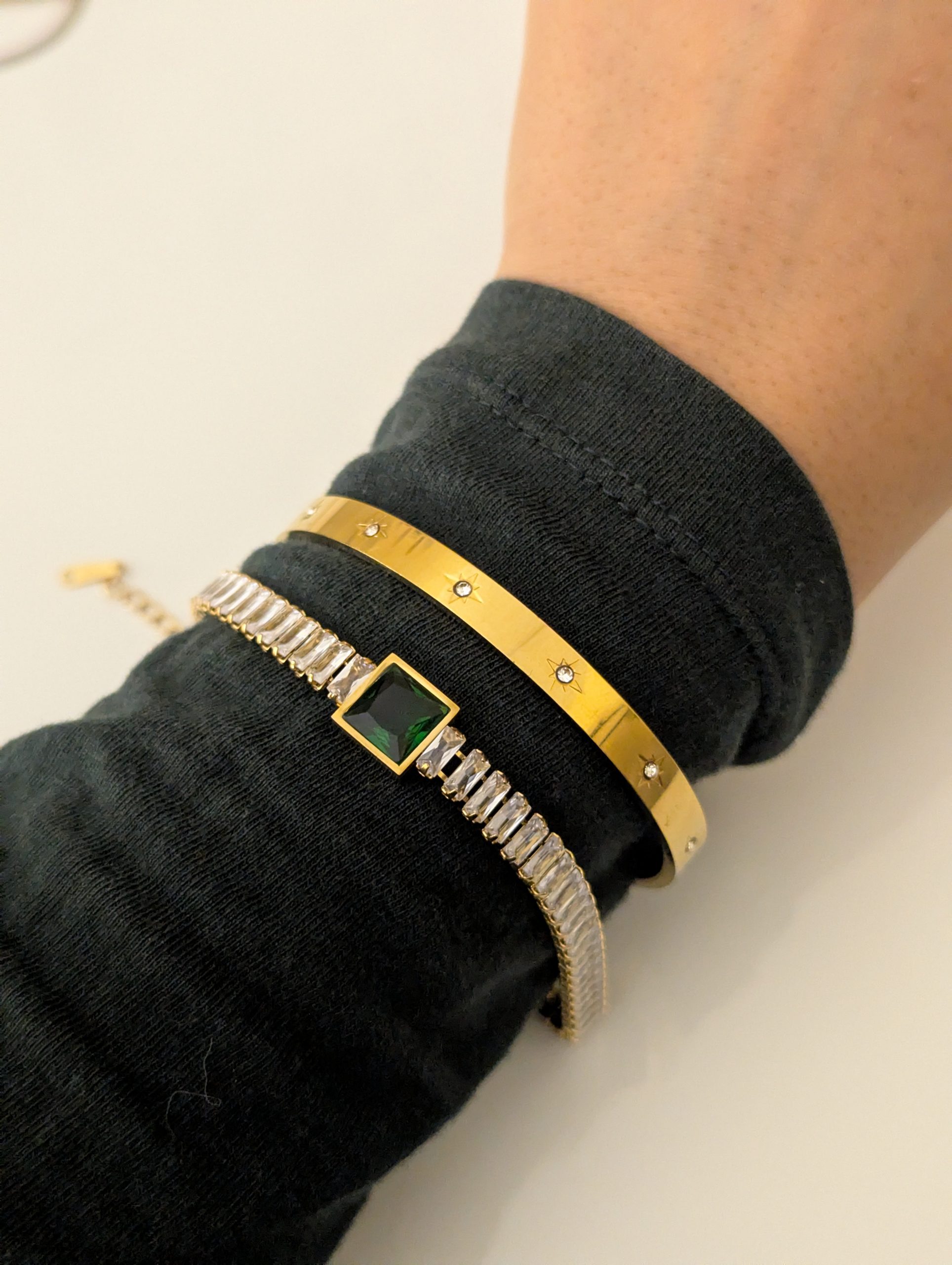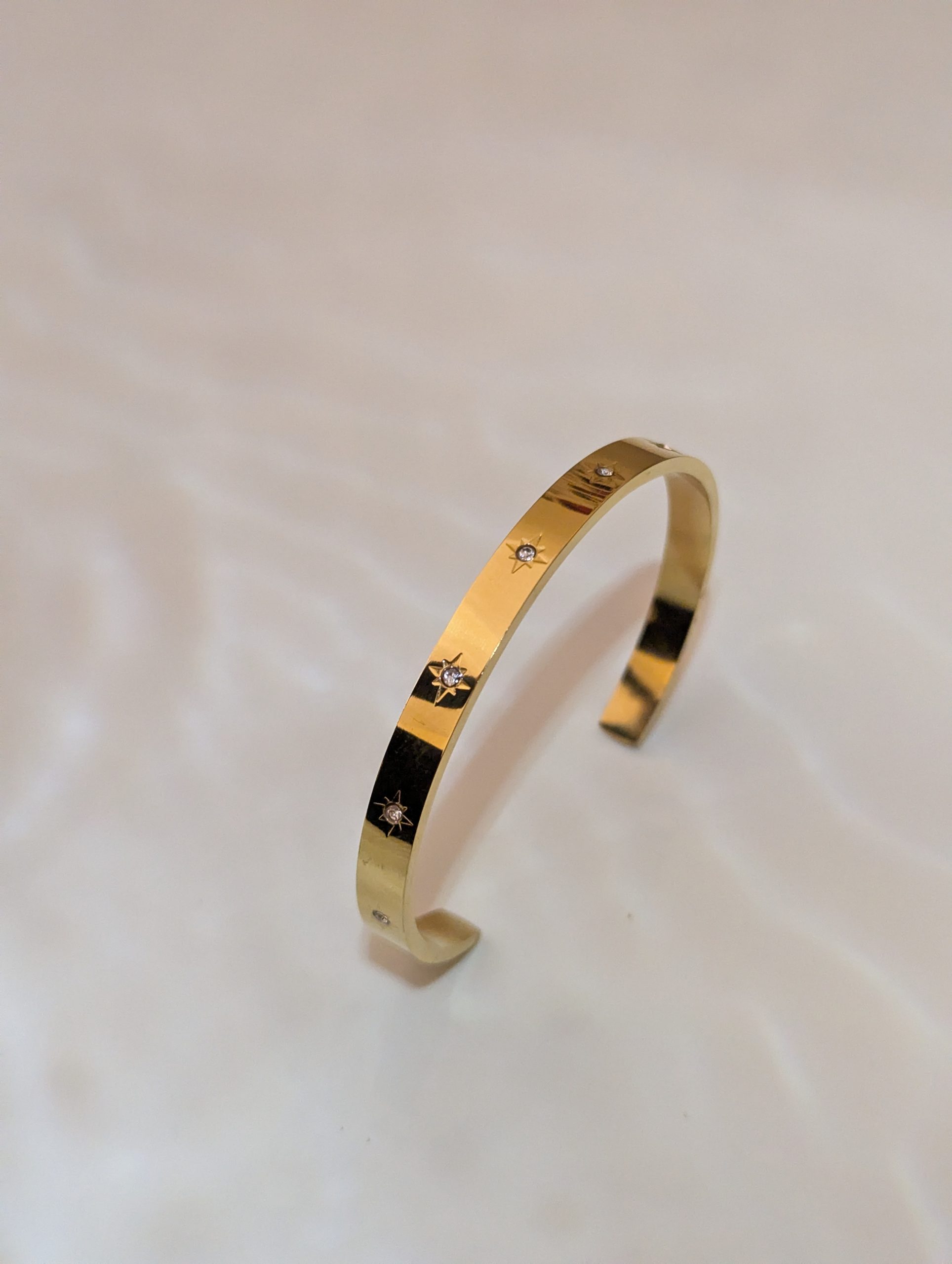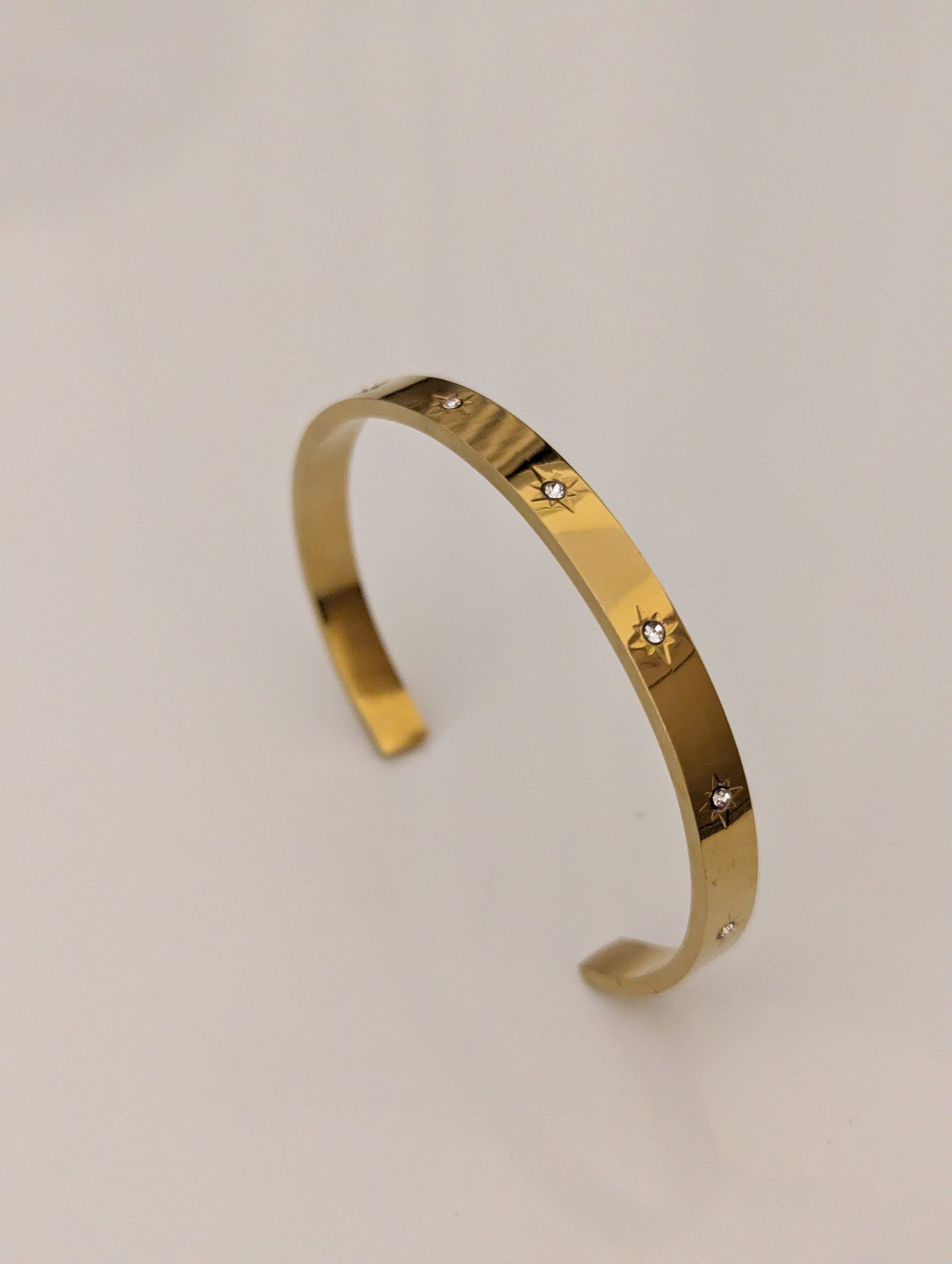 A rigid, gold-tone open cuff bangle with a flat surface. The band is detailed with engraved starburst patterns, each containing a small, clear stone in the center.