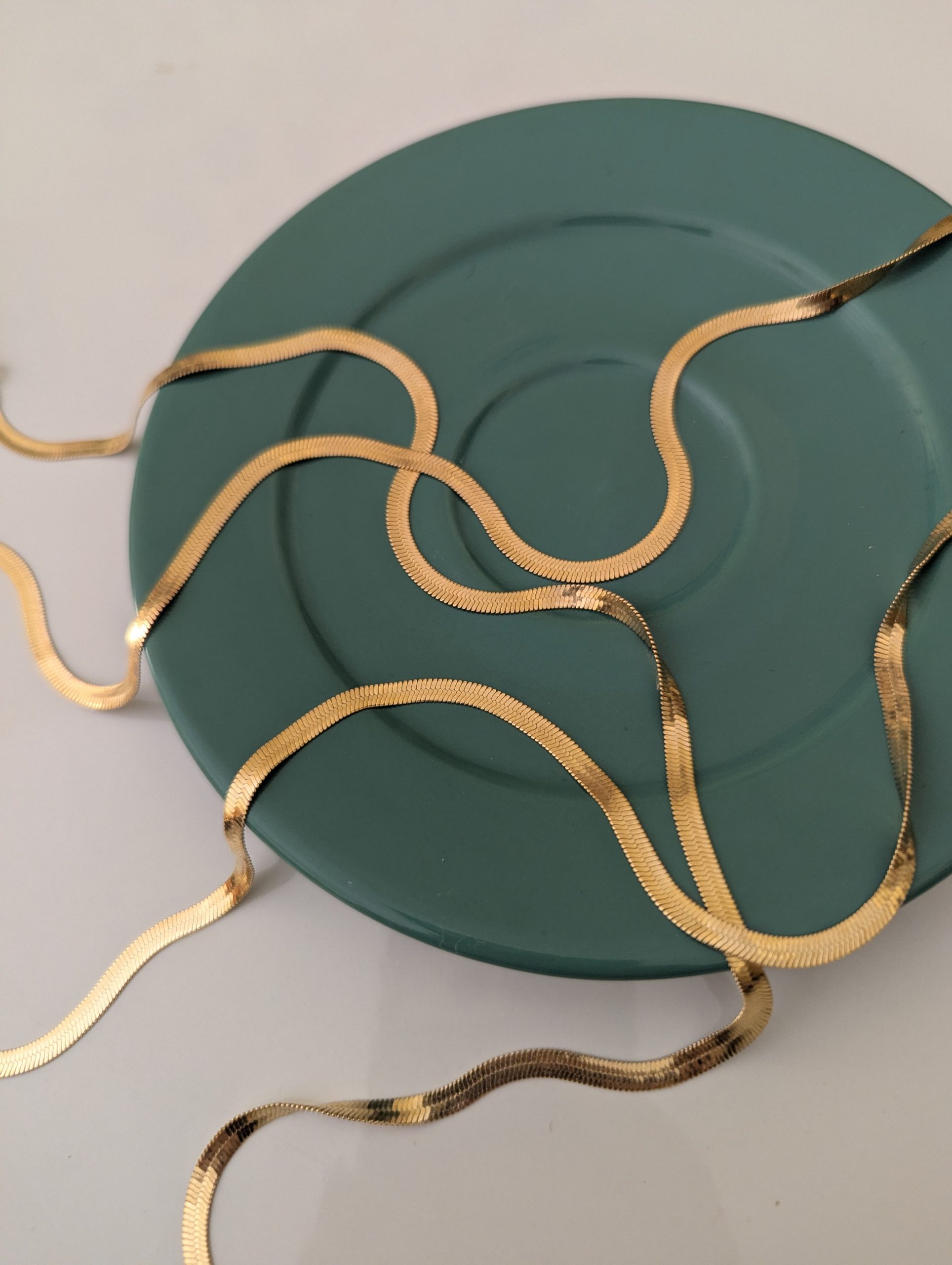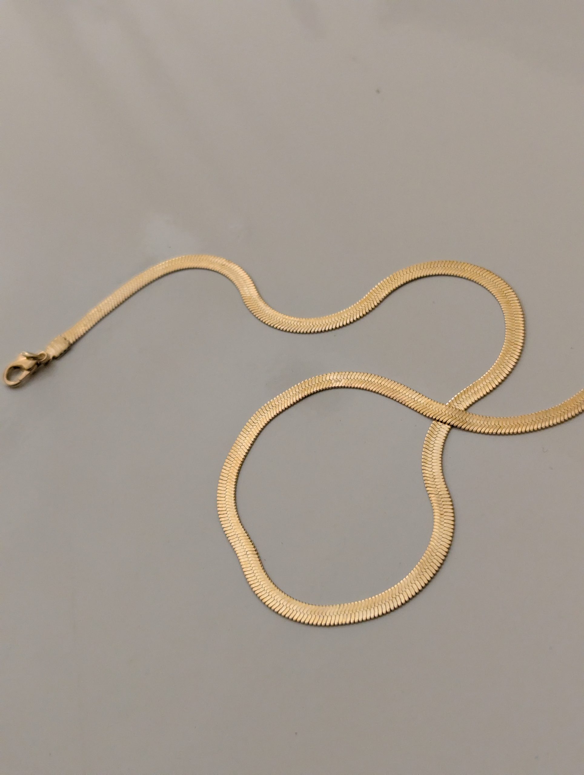 This classic herringbone chain features a high-polish finish and a flat-lay design that mimics the fluid movement of silk. A versatile staple for your collection, it works perfectly as a bold solo piece or the base of a layered look.