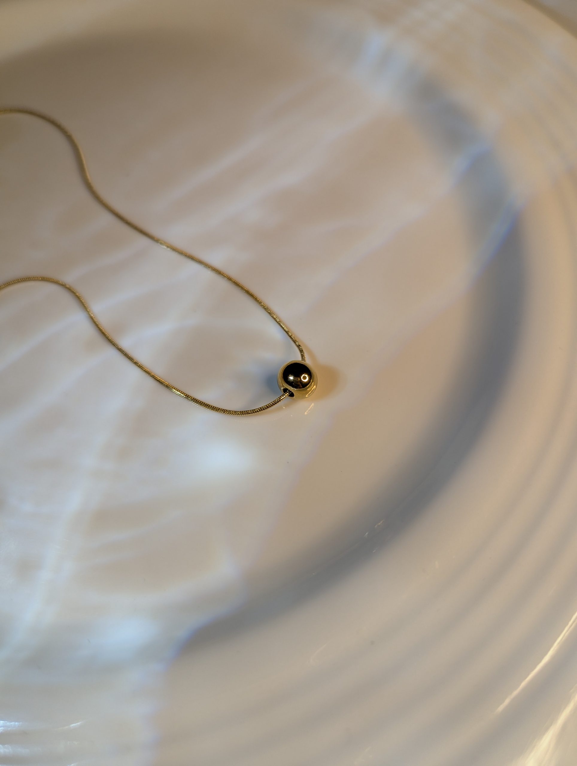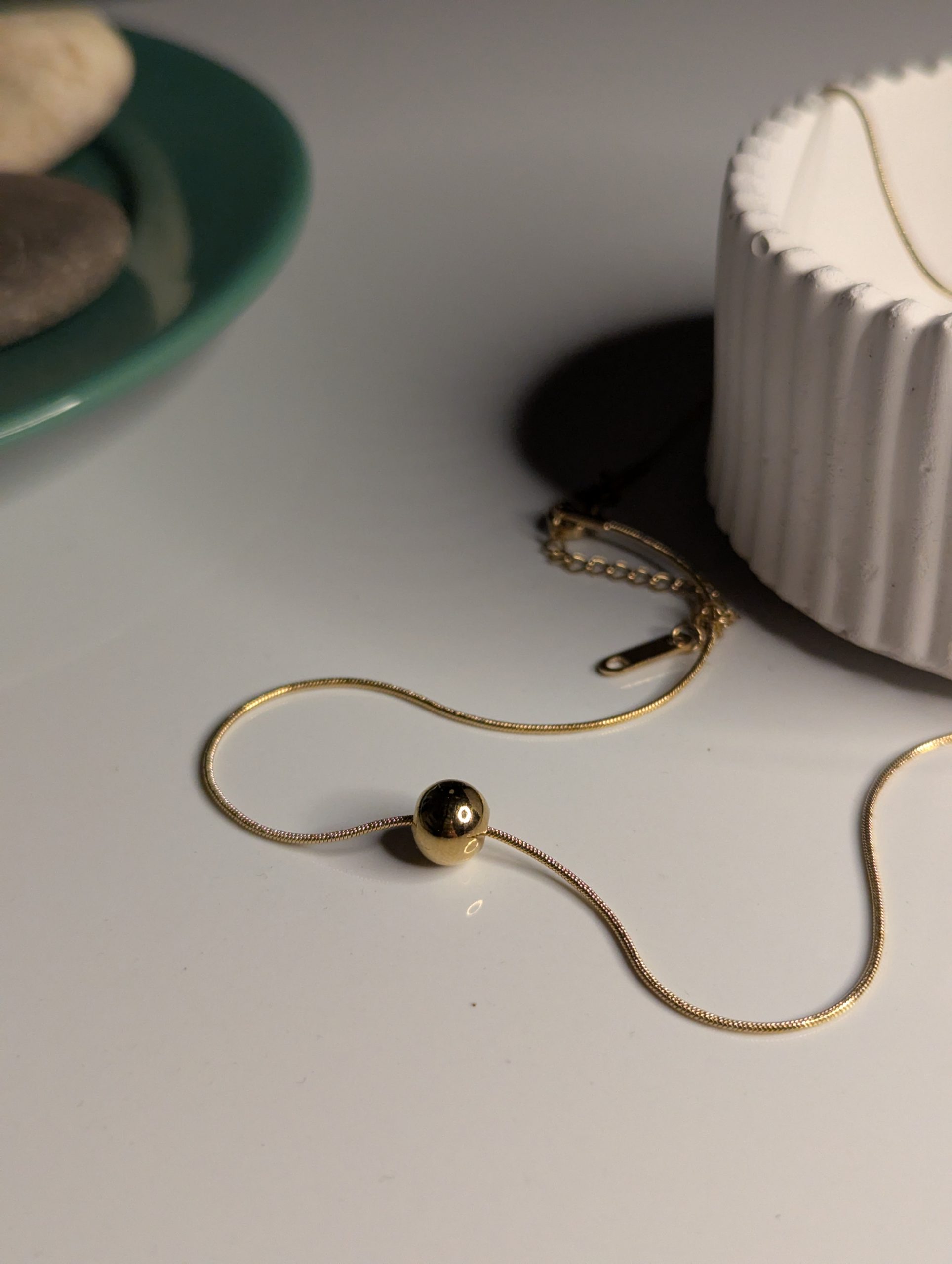 A single, high-polish gold bead sliding effortlessly on a sleek snake chain.