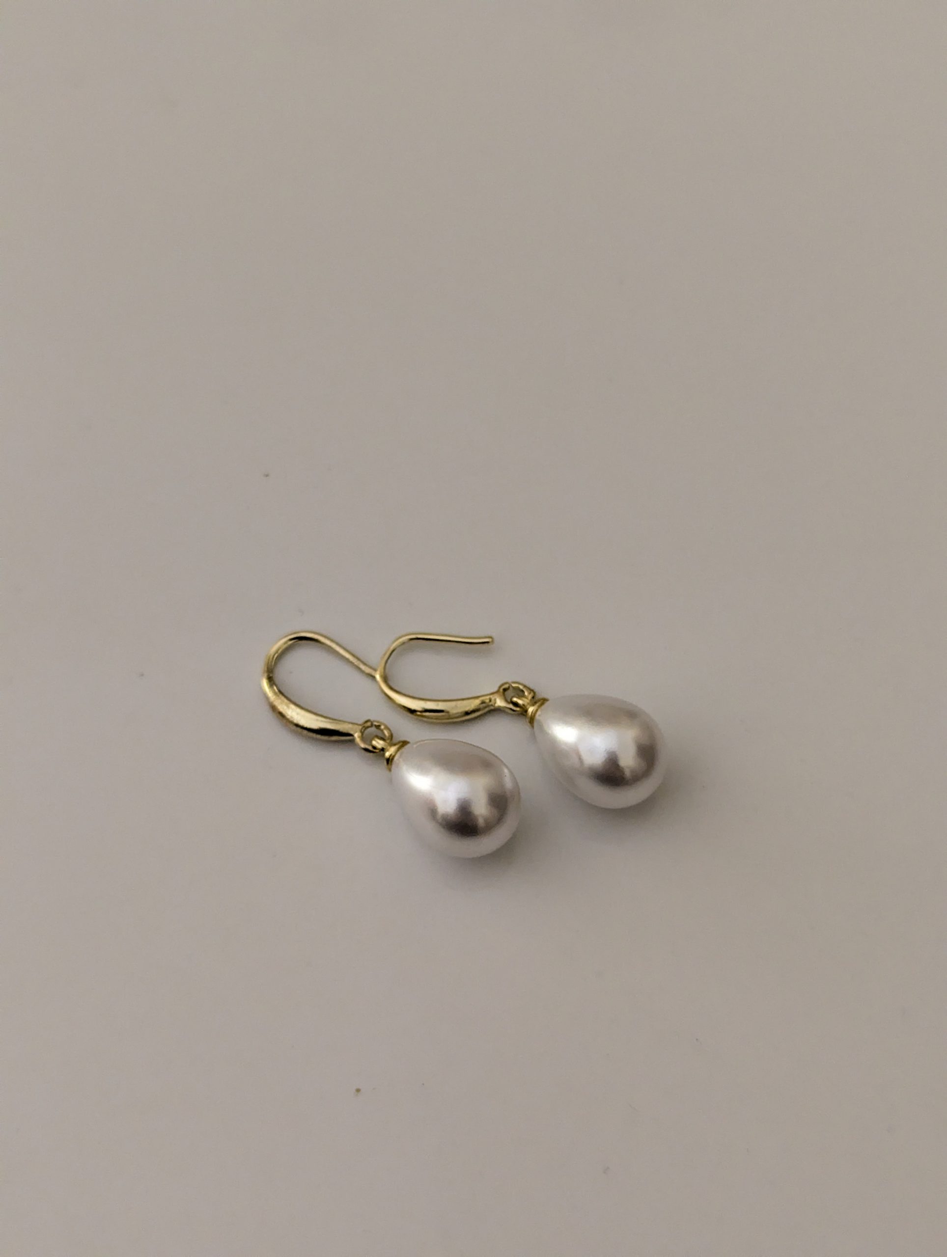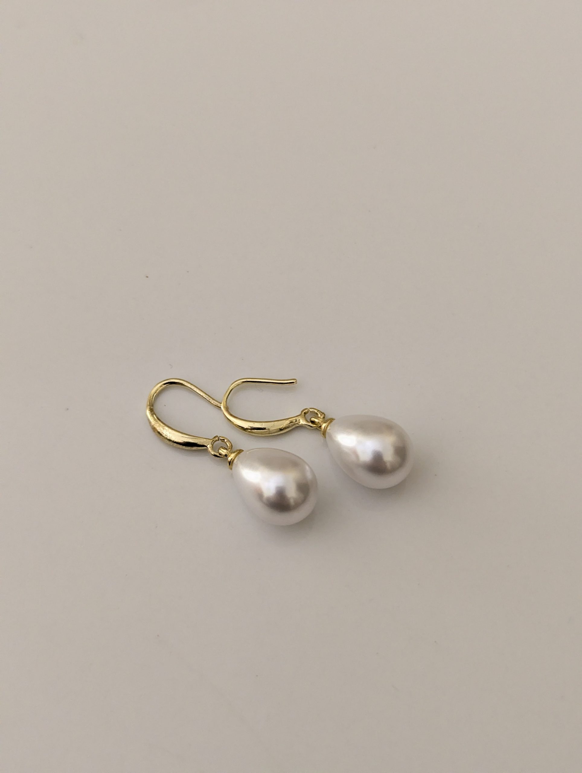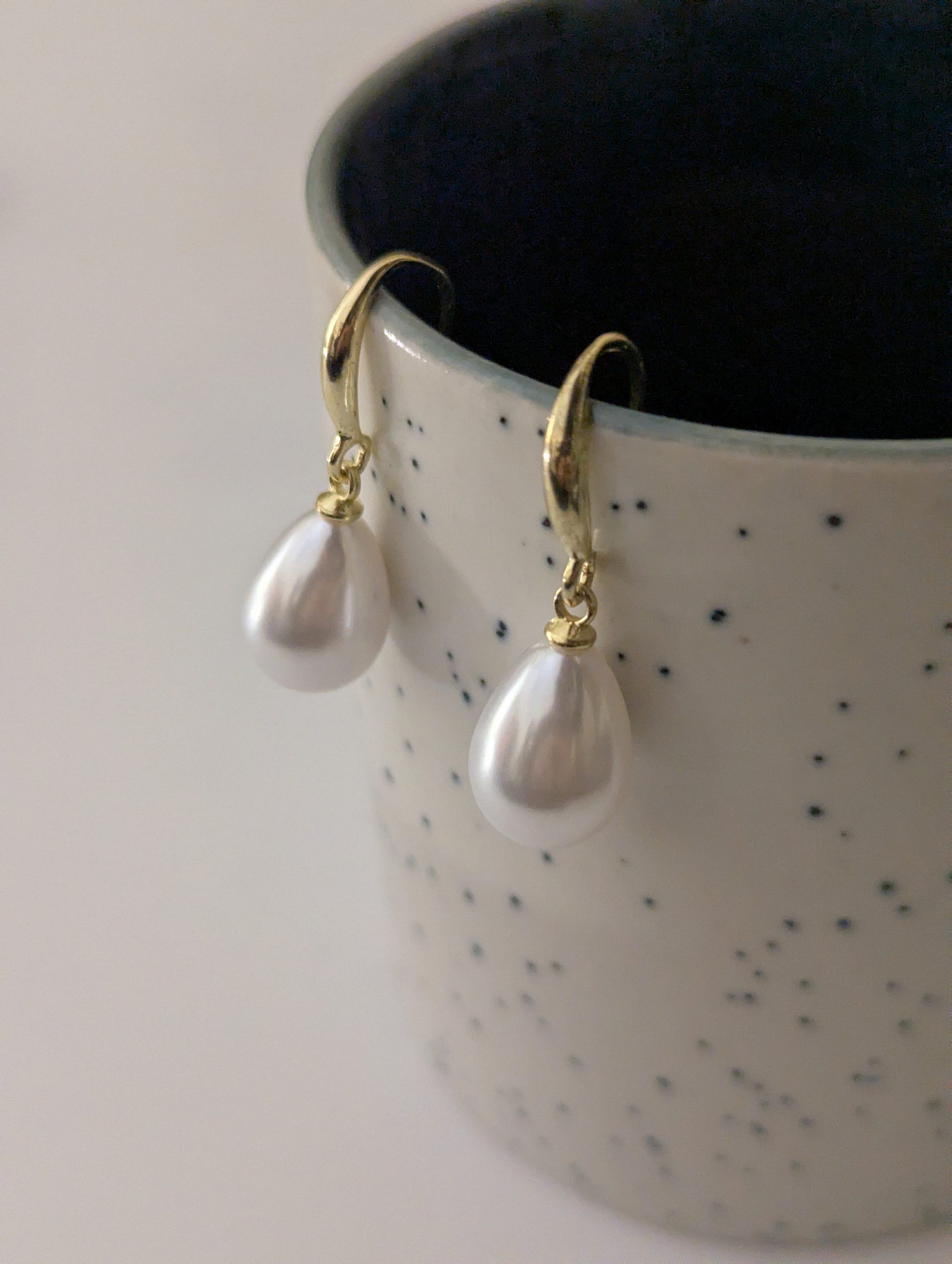 These classic earrings feature smooth, teardrop-shaped faux pearls with a high-luster finish. They are suspended from minimalist, polished gold-tone French hooks, creating a graceful and fluid movement when worn.